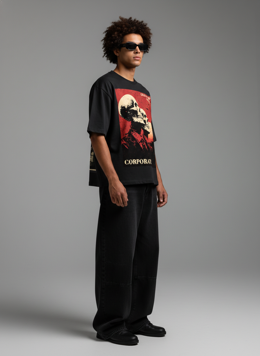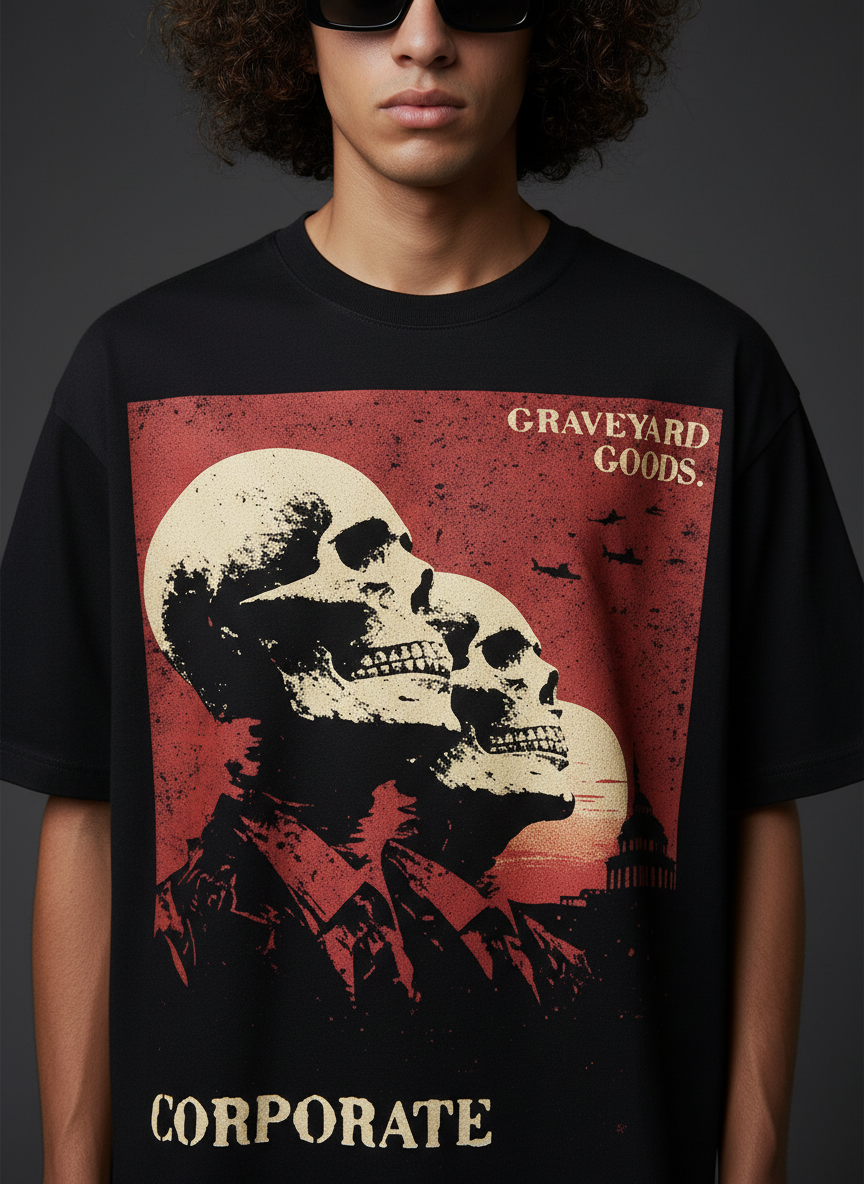 Productive. Replaceable. Compliant. MODEL EMPLOYEE is a critique of modern obedience  a uniform for those clocked in beyond life. The front presents skull figures aligned beneath a blood-red sky, facing forward in silent agreement. The back reveals the system in full: a skeletal worker seated at his desk, city looming behind him, labeled and approved. This piece reads like propaganda pulled from a broken future.