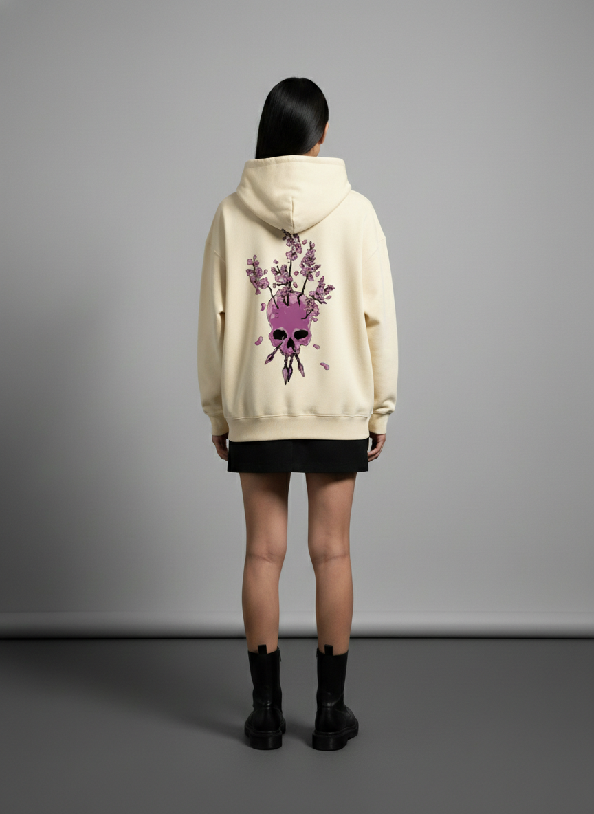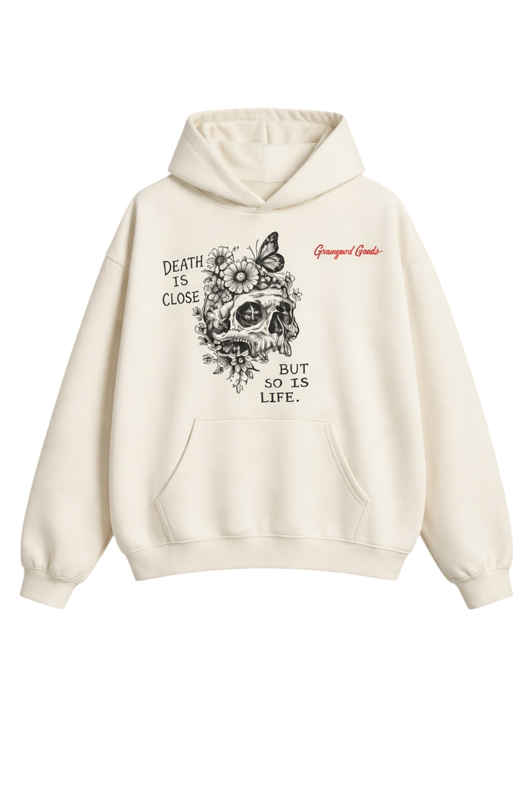Death is never distant. Death Is Close reflects the quiet truth that endings exist beside us at all times. The front artwork pairs a skull with organic elements, framing mortality not as fear, but as presence. This hoodie lives in the space between softness and inevitability worn as a reminder, not a warning.