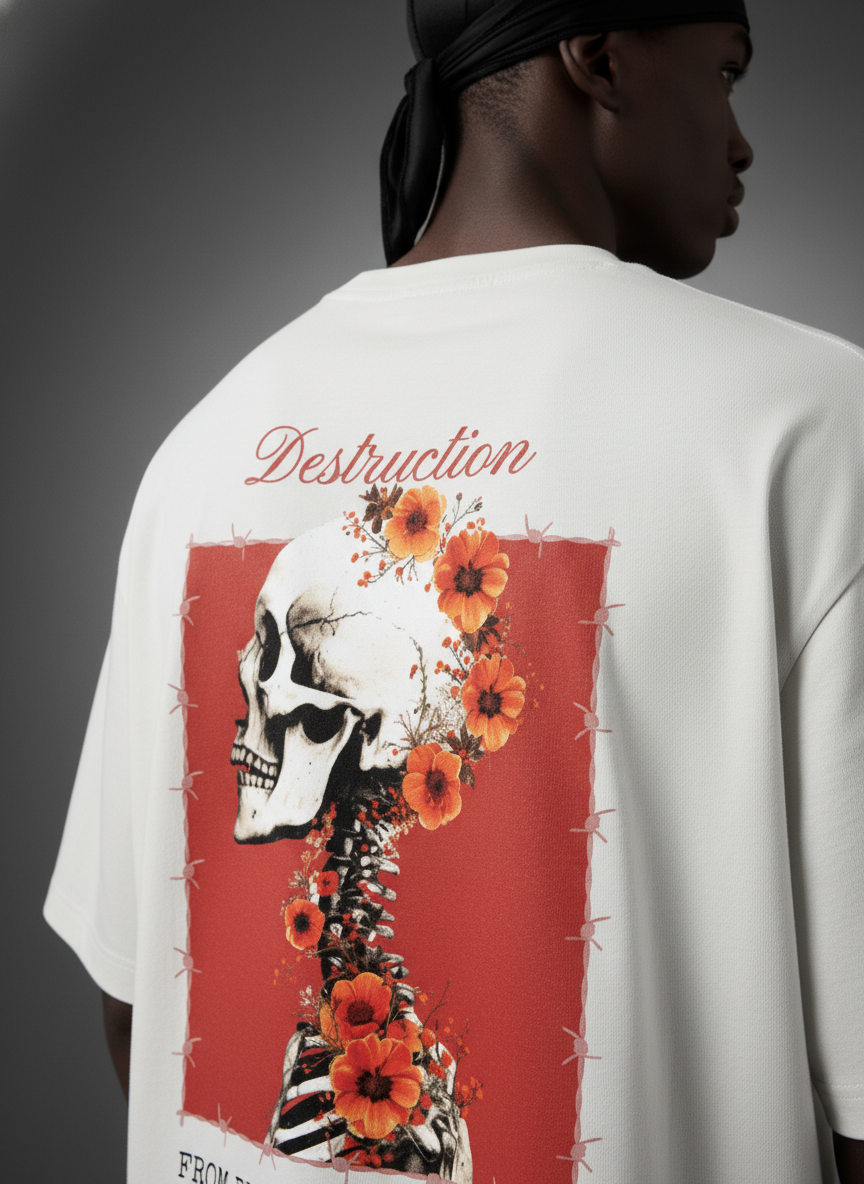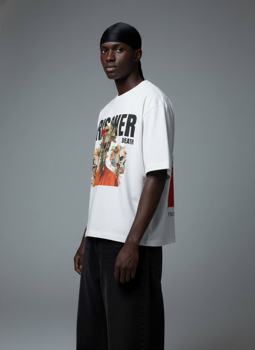 The sentence never ends. PRISONER UNTIL DEATH is built around forced identity and permanent confinement. The front declares the truth in plain terms  a skull overtaken by flowers beneath institutional language. The back continues the sentence, exposing destruction framed in orange, stitched and contained. This is not rebellion. This is recognition.