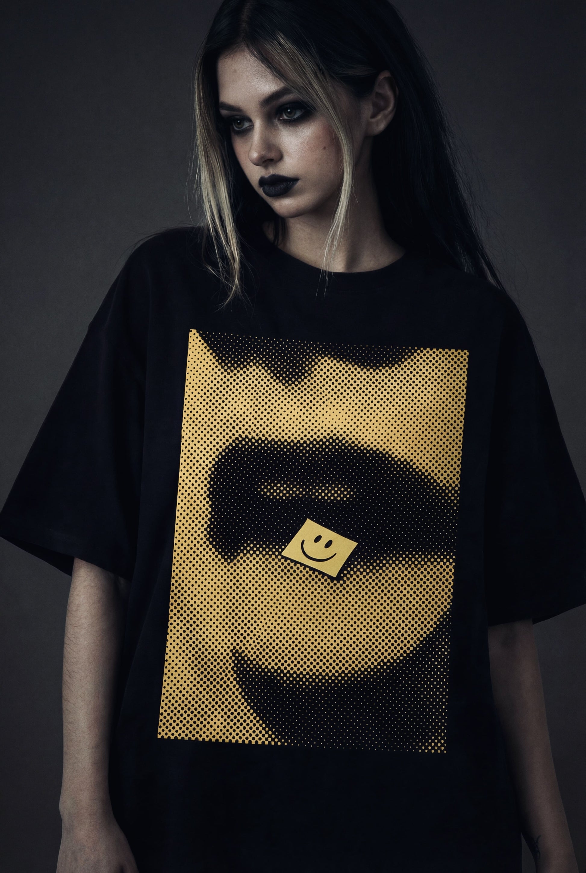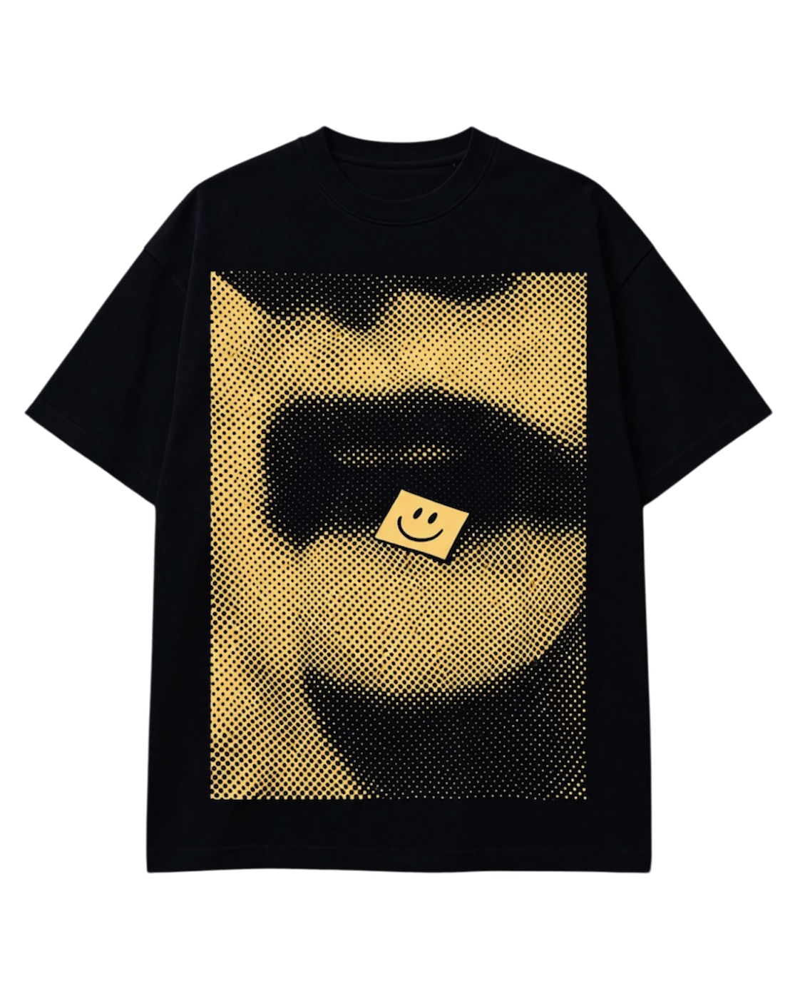 The front graphic captures a distorted grin, masked with a simple smiley,
