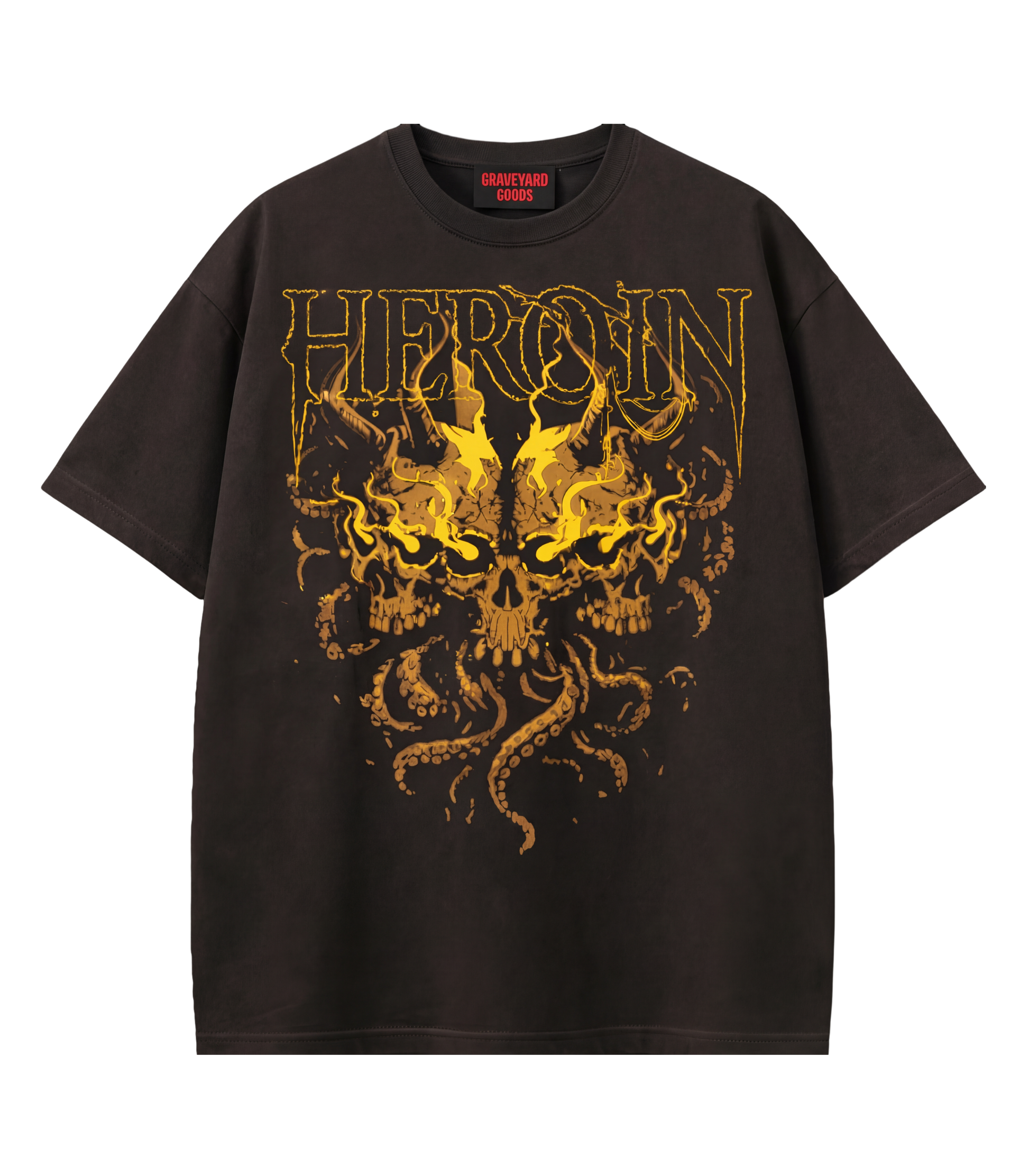 Addiction as devotion. Obsession as ritual. Heroin is a visual metaphor not a substance, but the slow burn of desire that consumes quietly. The flaming skull emerges from darkness, symbolizing dependence, temptation, and the beauty people find in what destroys them. This piece sits in the grey area between attraction and decay.
