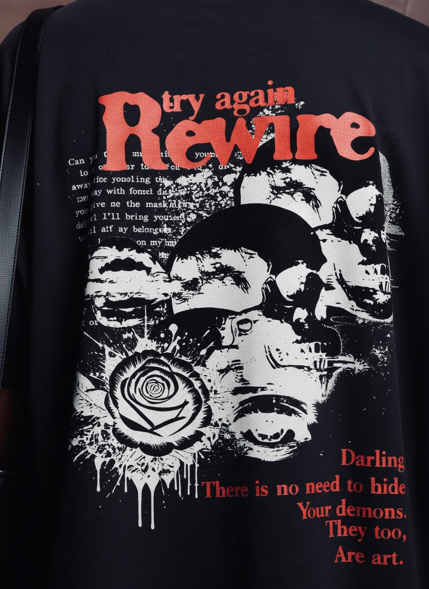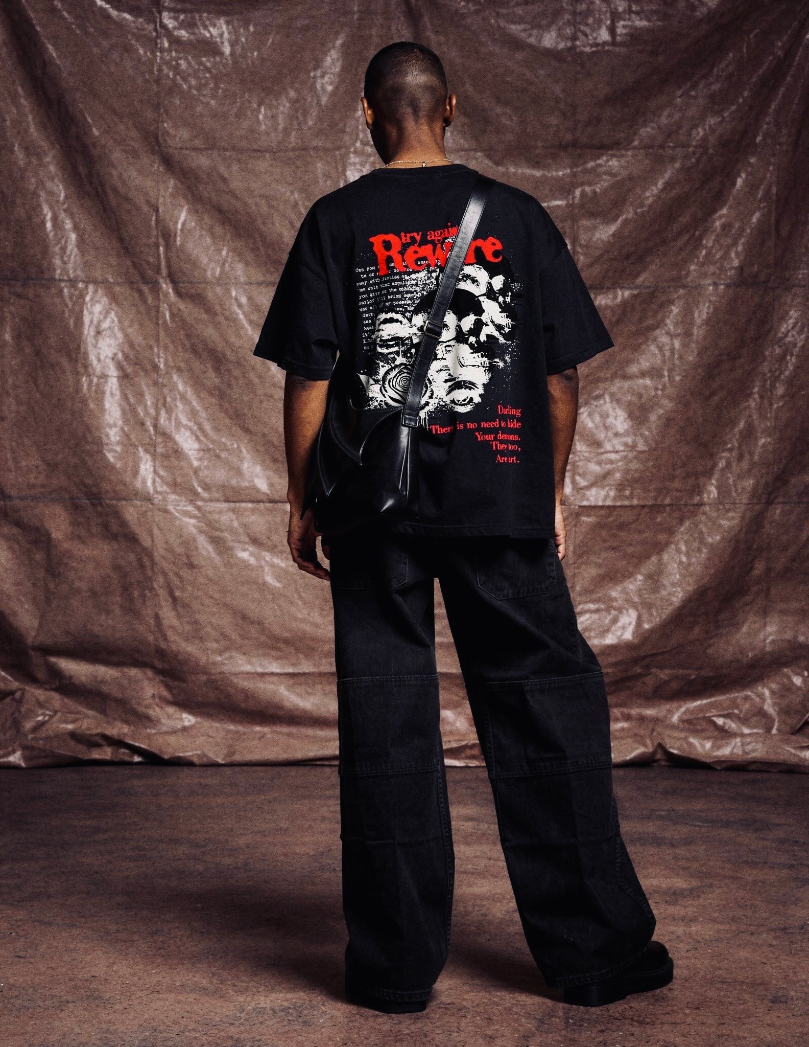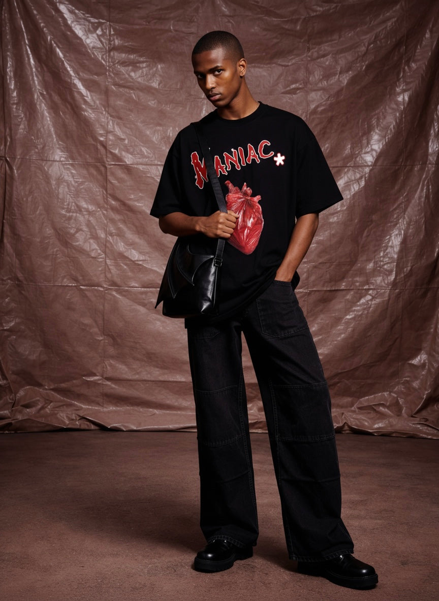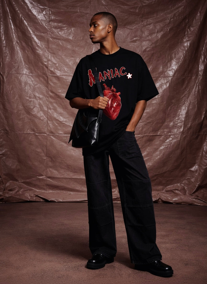 Love, distorted beyond repair. MANIAC is a portrait of obsession a torn heart suspended beneath the mark of madness. Rendered in violent red against deep black, the graphic feels exposed, raw, and unstable. This tee doesn’t romanticize chaos. It documents it. Worn like a confession you never meant to make.