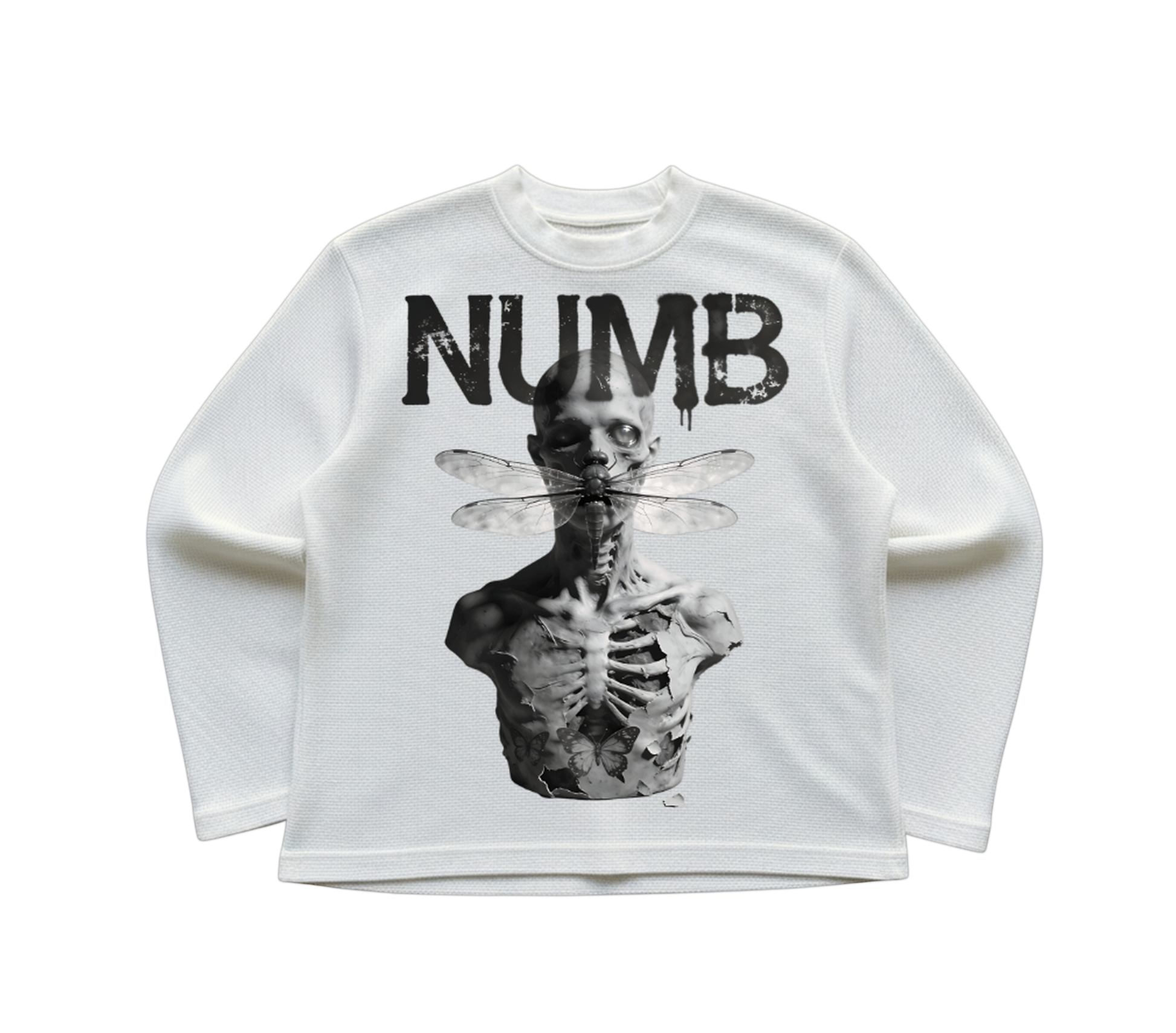 Silence made visible. NUMB captures emotional paralysis the moment where feeling fades but awareness remains. The skeletal form sealed by fragile wings represents restraint, suppression, and the weight of unspoken thoughts. This piece isn’t loud. It lingers.