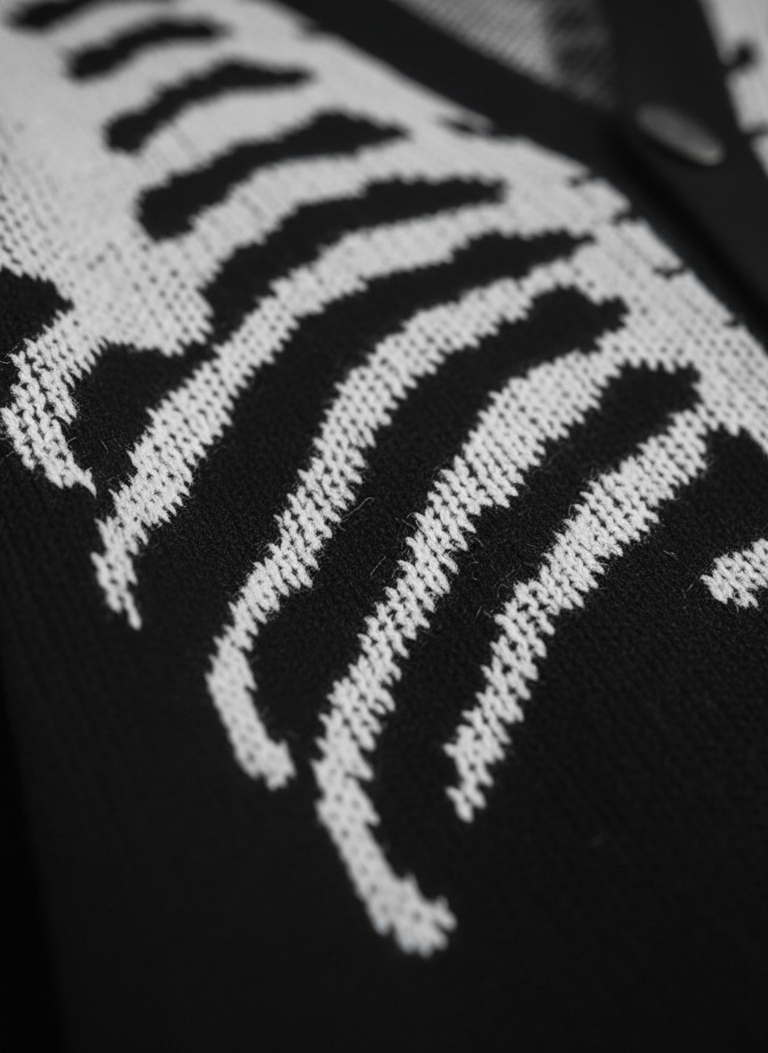 What’s inside is finally visible. RIBCAGE NO.01 strips the body down to structure. A skeletal form is woven directly into the garment not printed, not layered, but built into the knit itself. Floating between garment and artifact, this piece wears like a second frame. Quiet, exposed, deliberate.