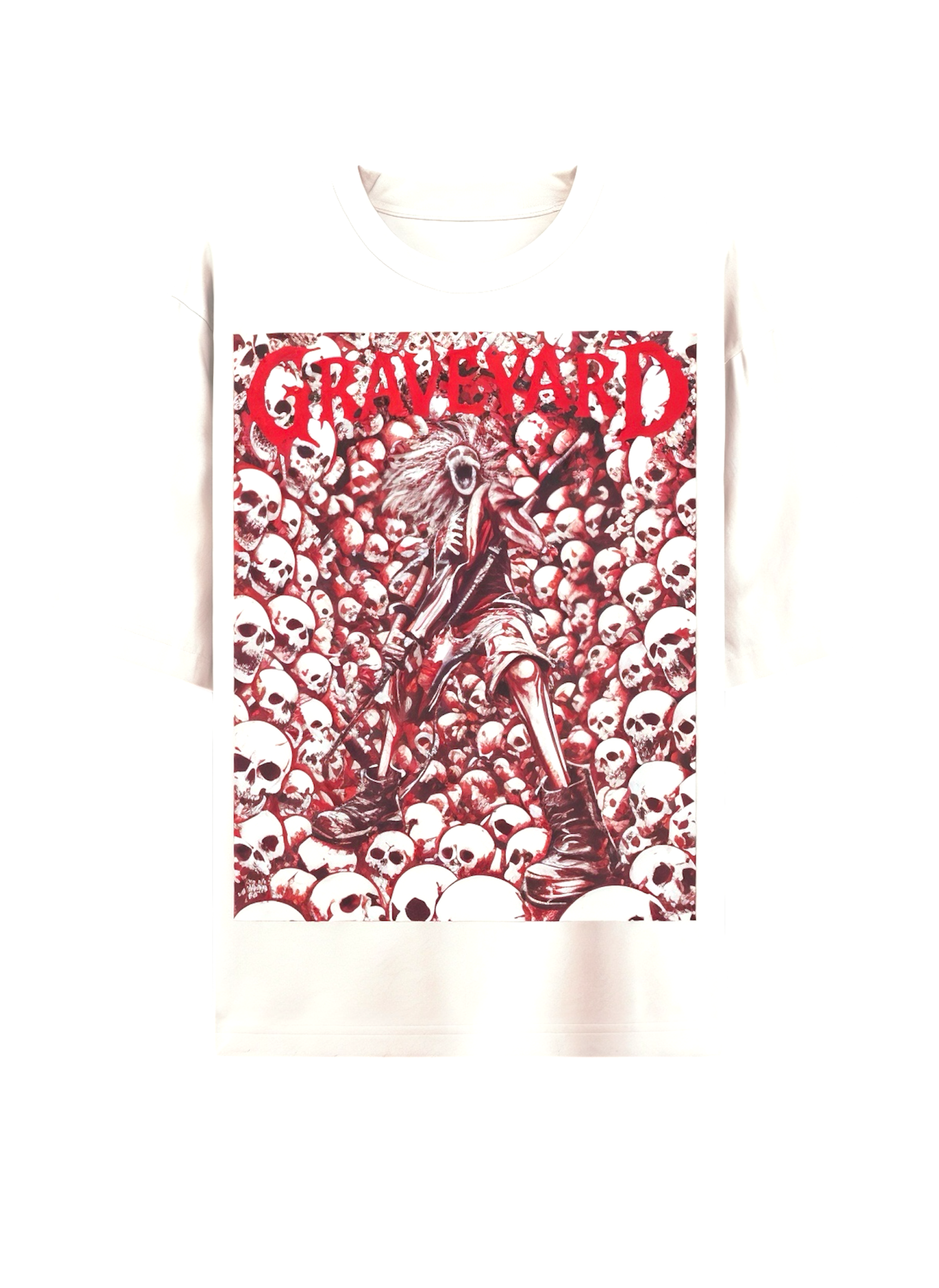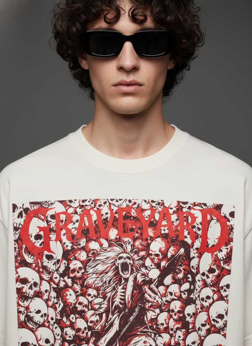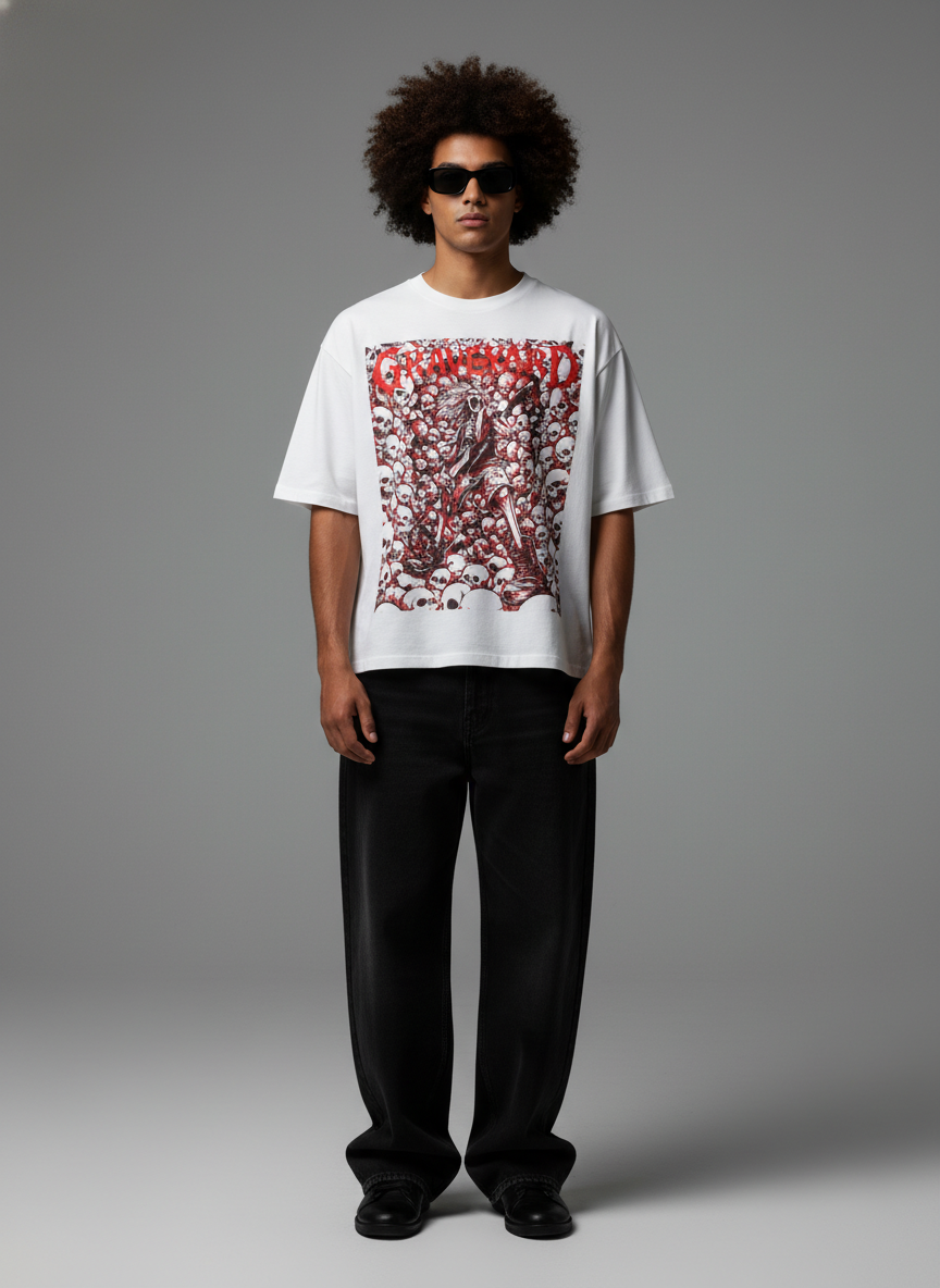 • Front chest artwork with layered skull composition and GRAVEYARD typography