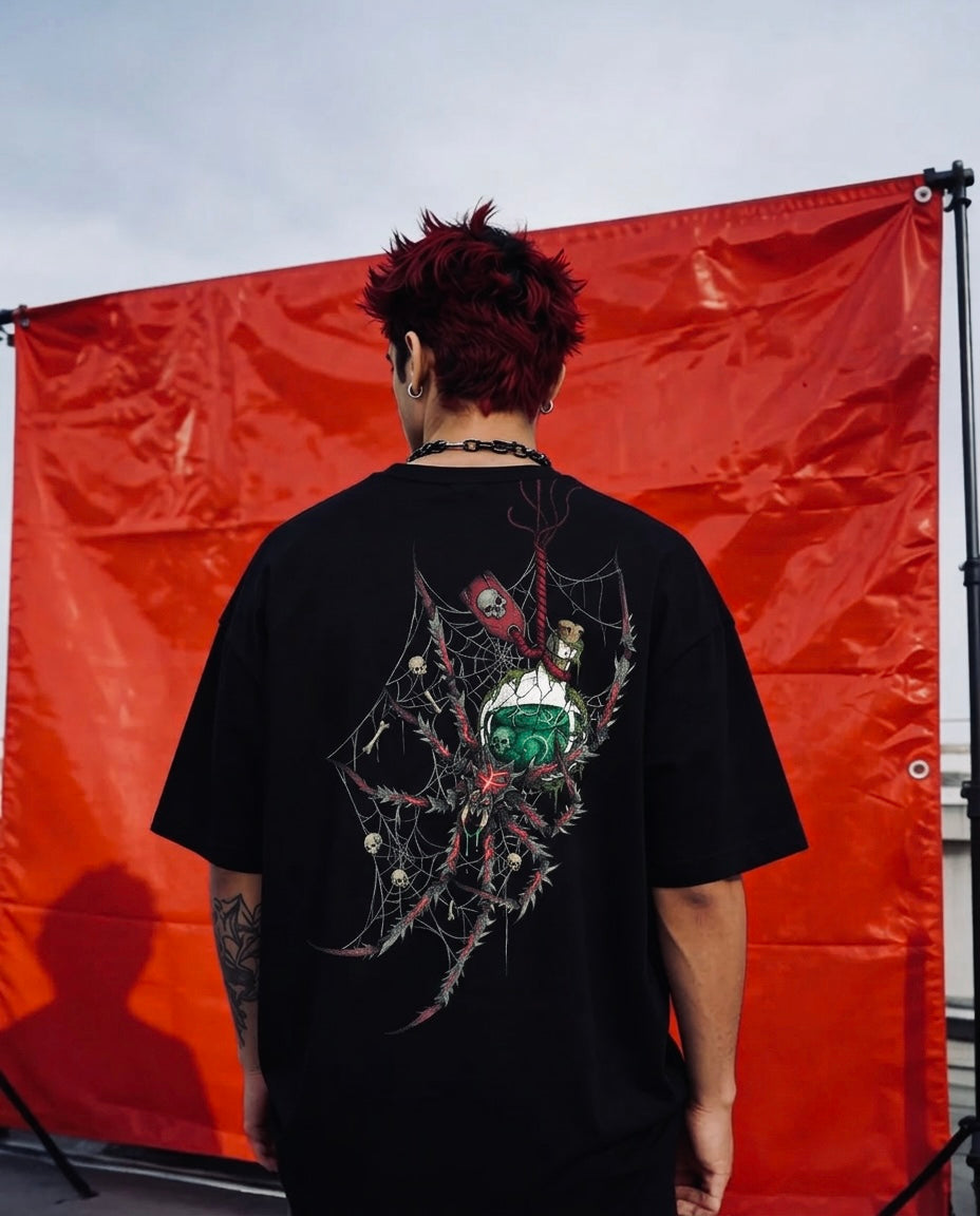 The red script bleeds across the chest like a warning you ignored. Turn to the back and the form mutates into something mythic: spine stretched into a weapon, wings built from ruin, trophies hanging like forgotten loyalties.