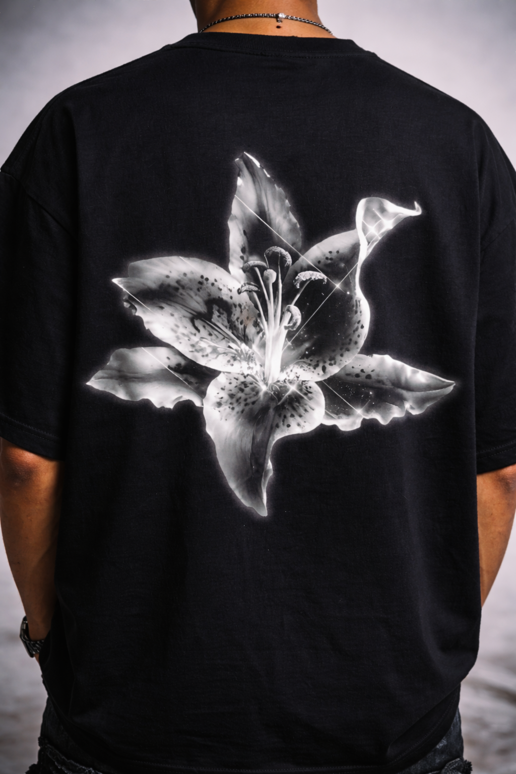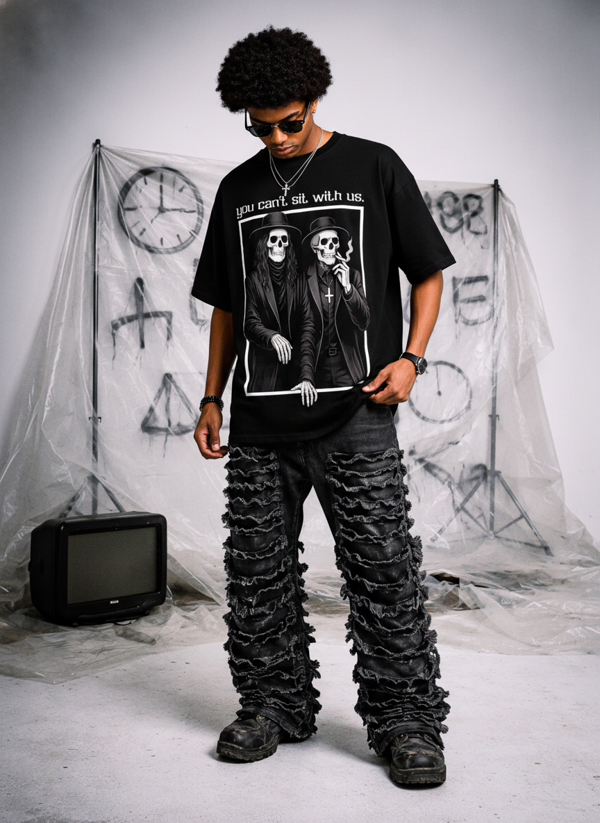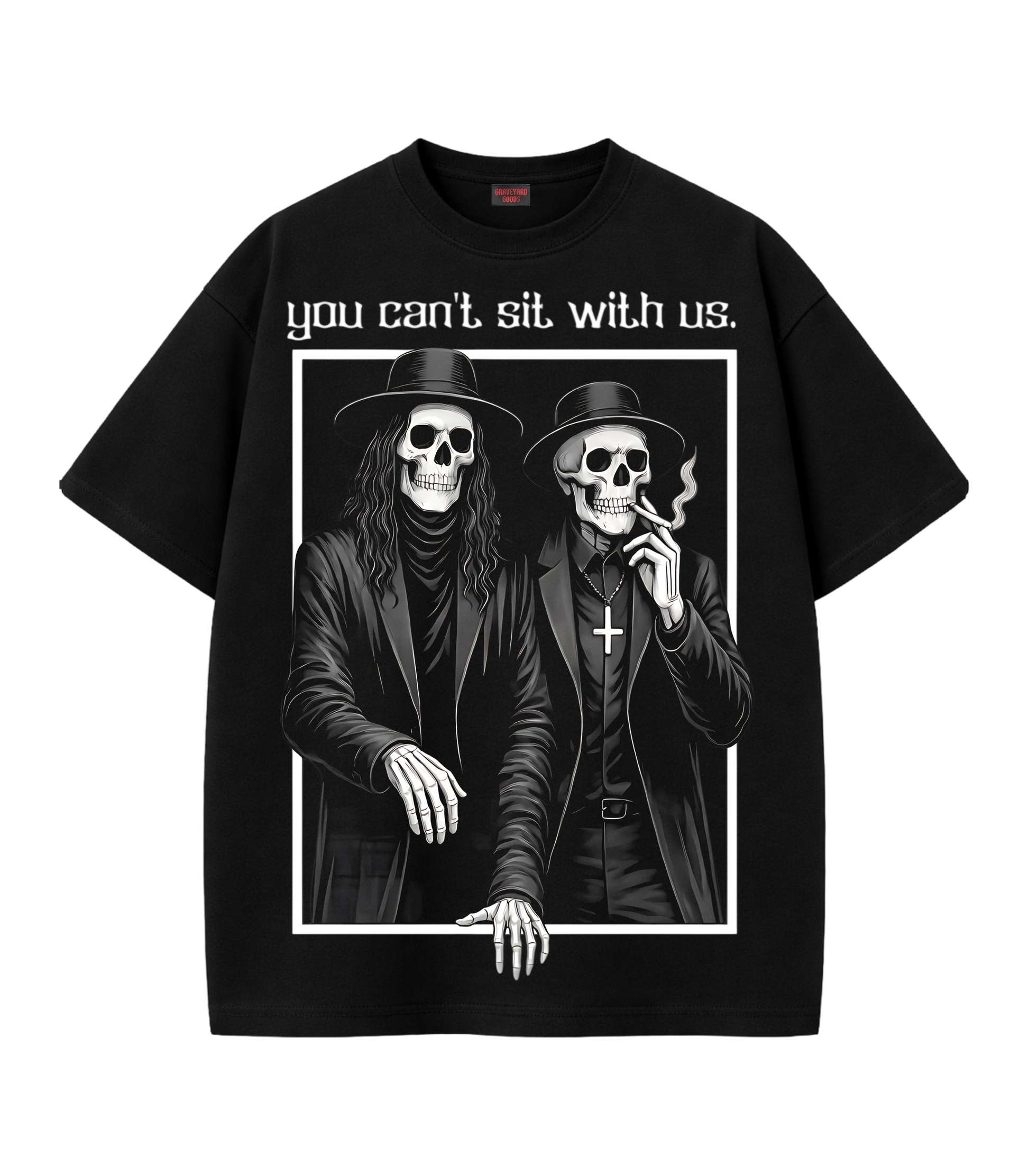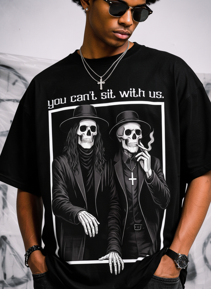Outcast by choice. EXCOMMUNICATED is a statement of refusal a line drawn between those who belong and those who observe. The front graphic presents two skeletal figures dressed in ritual black, framed like a forbidden photograph beneath the phrase “you can’t sit with us.” It’s not arrogance. It’s separation. Turn the piece around and a ghostly white flower blooms across the back fragile, luminous, and untouched. Beauty survives, even in exile.
